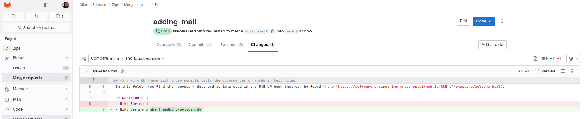 editing-readmebranch to your repository on Gitlab. The merge request from there back to themainbranch of the main repository will update automatically.