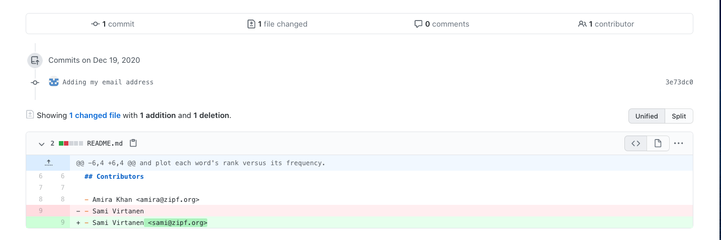 sami:~/zipf $ git commit -a -m "Adding my email address"