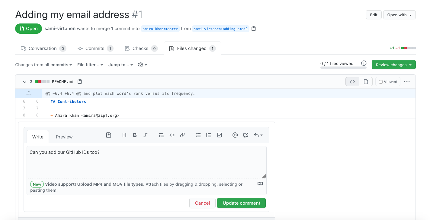 While Amira is working, GitHub has been emailing notifications to both Sami and Amira. When Sami clicks on the link in their email notification, it takes them to the PR and shows Amira’s comment. Sami changes README.md, commits, and pushes, but does not create a new pull request or do anything to the existing one.